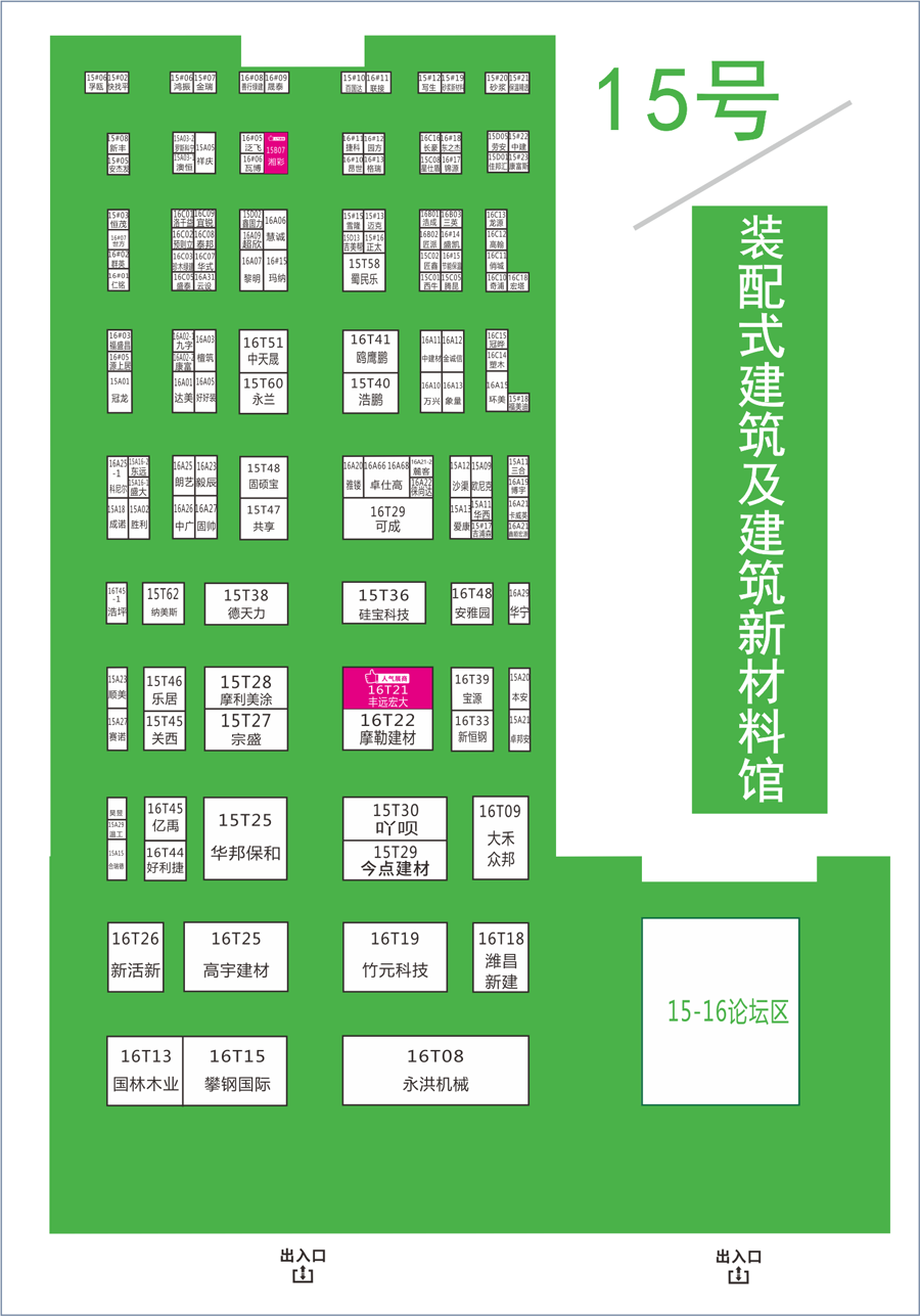 1/2/3號門窗館;3-4連接館 陶瓷展區;4號智能家居/衛浴館;5號墻面/吊頂/地材/軟裝館;5-6連接館 照明展區;9號活動論壇館;10號暖通凈水館;10-11連接館 廚電展區;11/14號定制家居館;14—15連接館 定制設備展區;15號建筑新材料館;16號裝配式建筑/園林館。